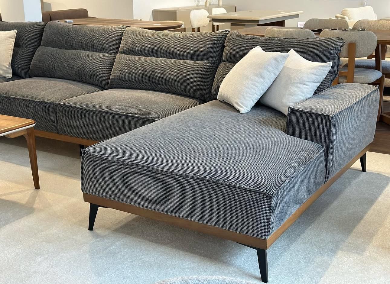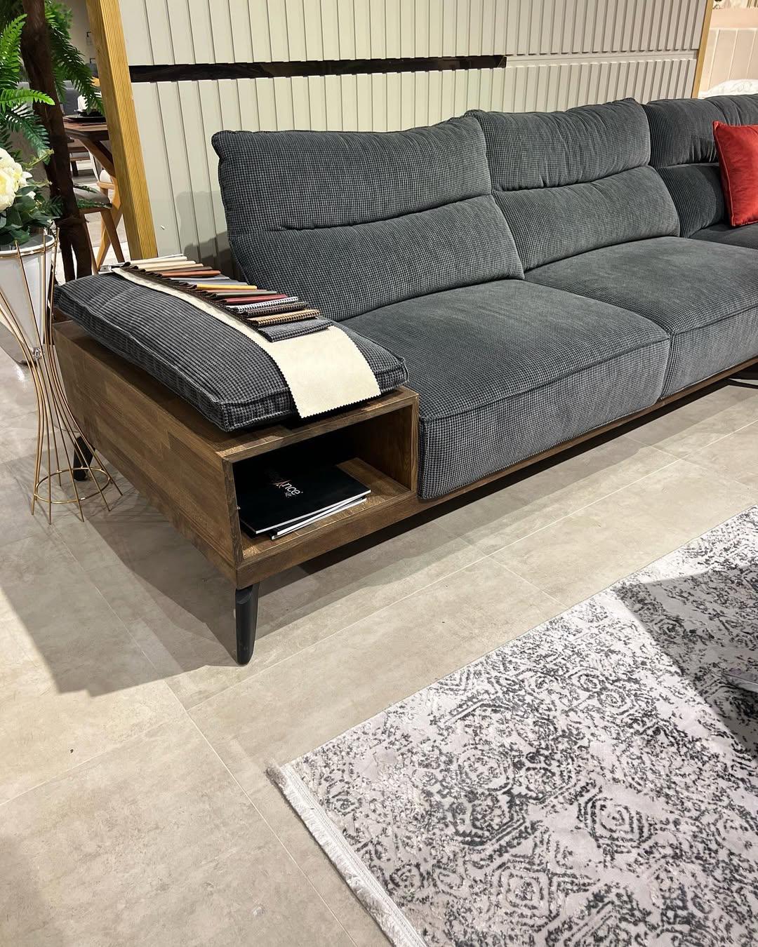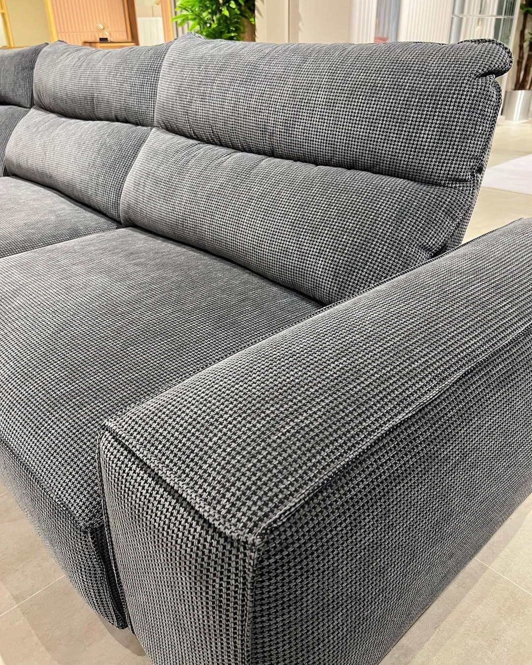 Manhattan corner sofa 335 cm in charcoal shaved wool fabric, chaise longue 165 cm, delivered with 4 cushions. Angle of your choice in front of the sofa.